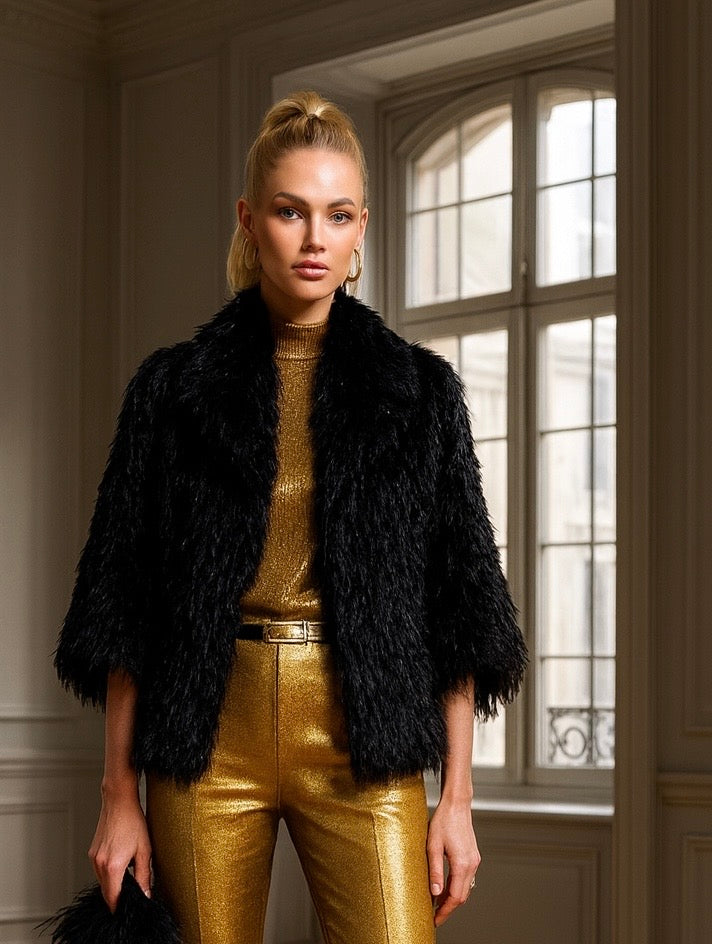 Es una pieza espectacular que combina el glamour de una capa con la practicidad de una chaqueta, está formada por un tejido de pequeñas plumitas planas, ideal para looks de noche o de invitada, aportando volumen y lujo de manera sutil y contemporánea.