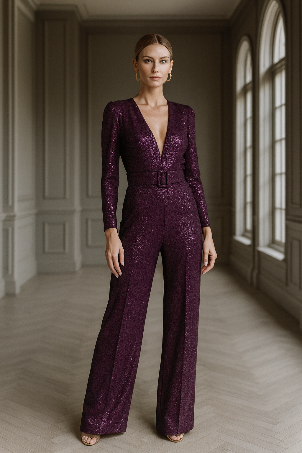 Espectacular mono realizado completamente en tejido de lentejuelas, fabuloso escote en v con transparencia.