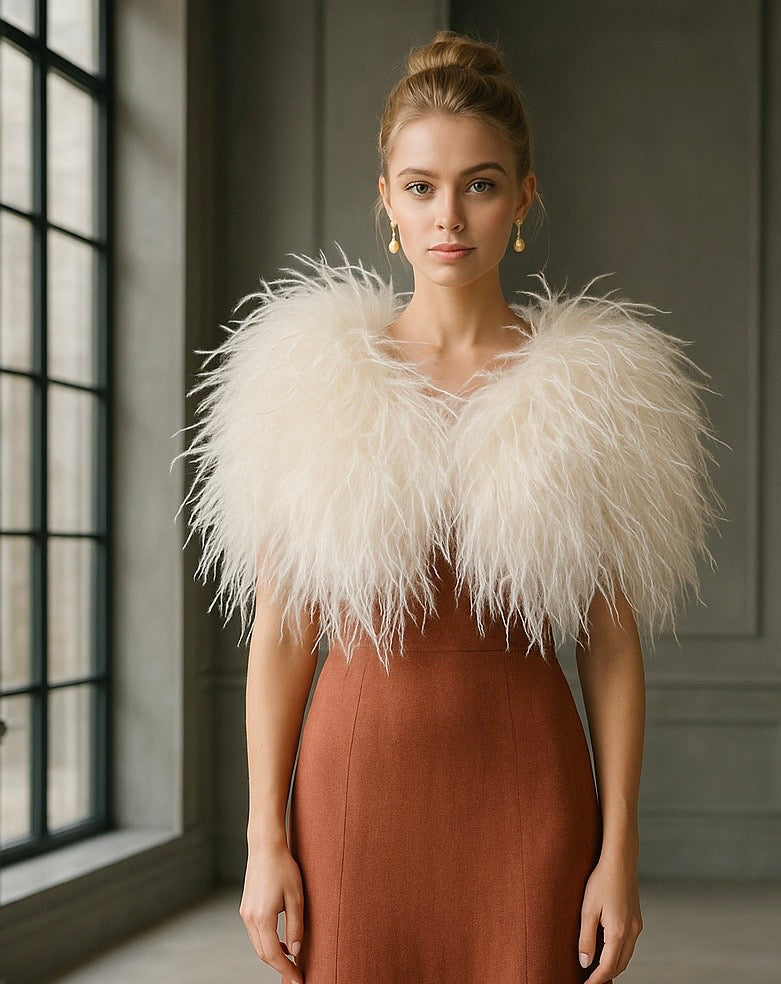 Deslumbra con esta espectacular estola confeccionada con auténticas plumas largas de avestruz, diseñadas para envolver los hombros con un aire de sofisticación y glamour. Su textura ligera y volumétrica aporta movimiento y presencia, convirtiéndola en la pieza perfecta para elevar cualquier look de gala o evento especial.
