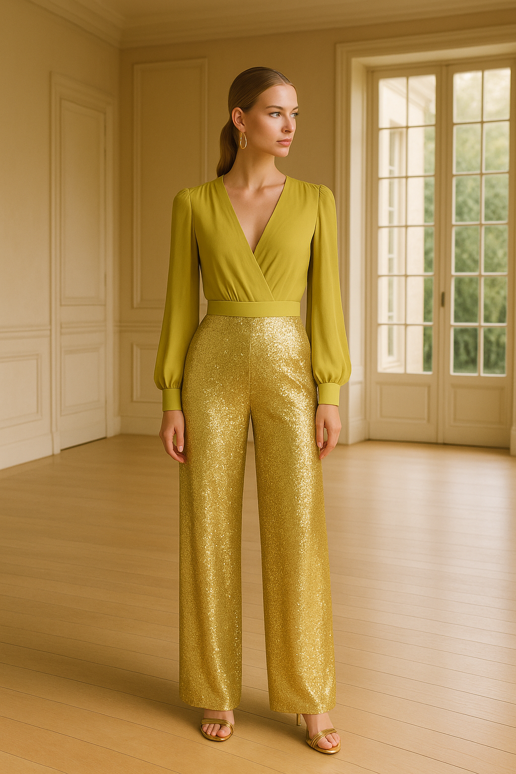 Espectacular mono con cuerpo en gasa, escote en v cruzado y manga larga con abertura