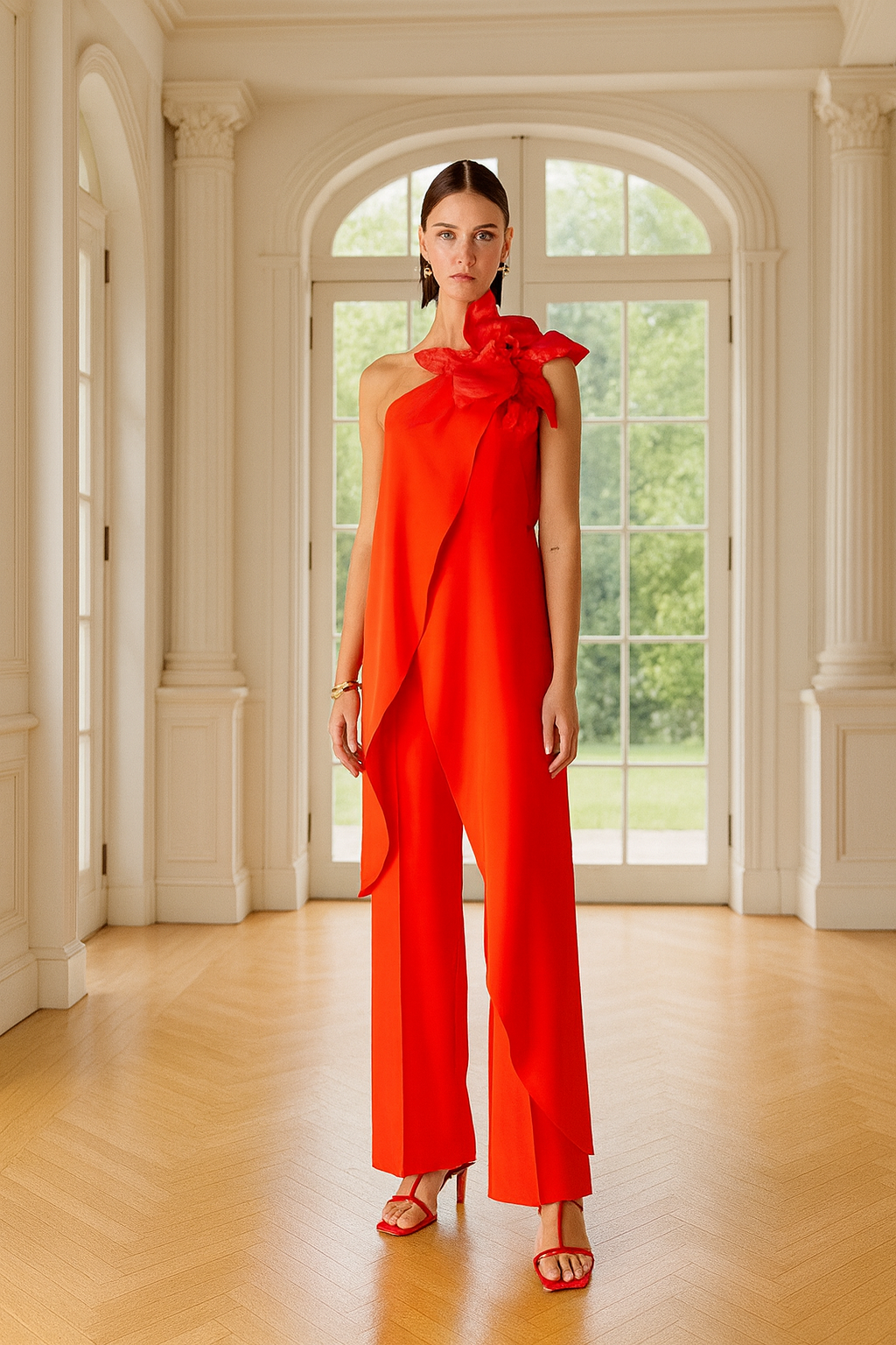 Mono de corte asimétrico a un hombro con capa cruzada y detalle de aplicación floral desmontable.
