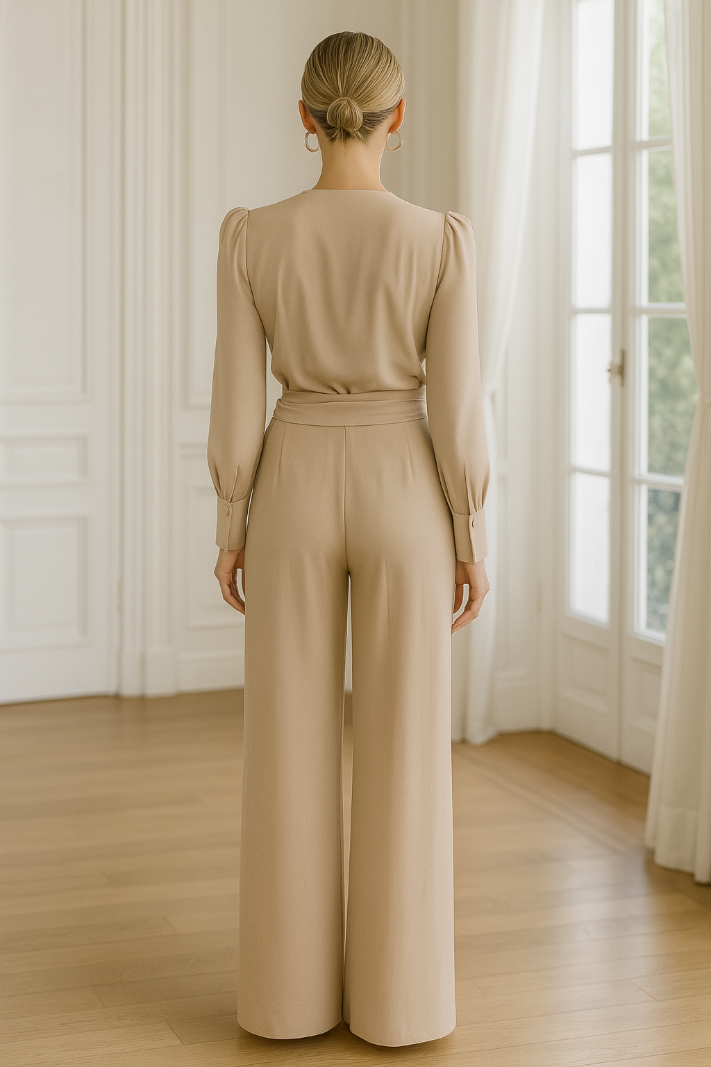 Pantalón palazzo con capa lateral y top con manga larga con laza lateral