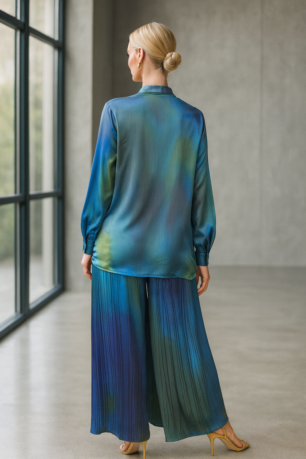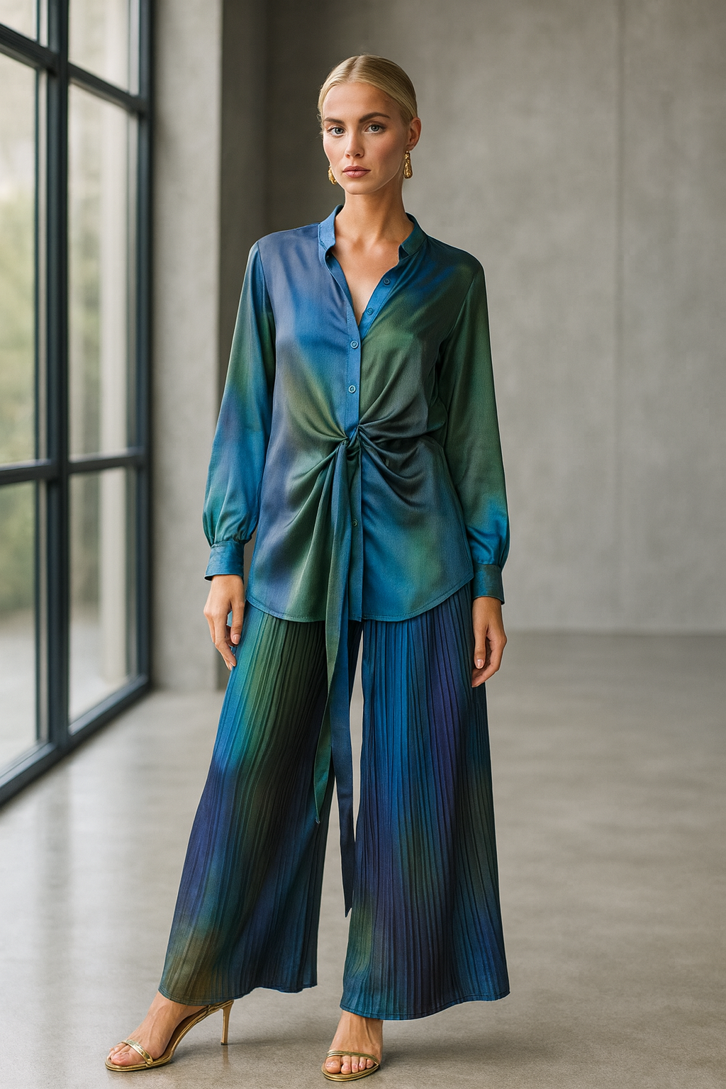 Este elegante set en tejido satén combina una blusa fluida con nudo frontal y pantalones palazo de caída ligera, creando un look sofisticado y moderno. Su estampado en tonos azules y verdes con efecto tornasolado aporta un toque de lujo y movimiento, ideal para destacar con estilo en cualquier ocasión.