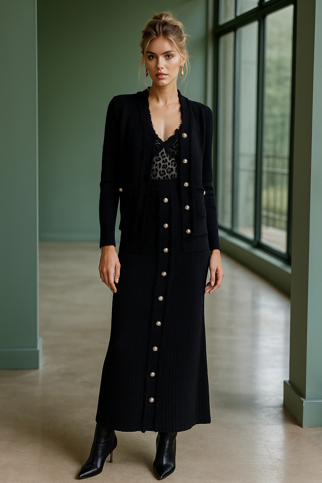 Conjunto de punto elegante compuesto por chaqueta y falda larga con textura estructurada y botones dorados al frente. La chaqueta, de corte recto y detalles deshilachados, aporta un toque sofisticado, mientras que la falda de línea recta estiliza la figura. Un look refinado y versátil, ideal para ocasiones especiales o para elevar un estilo diario con elegancia moderna.