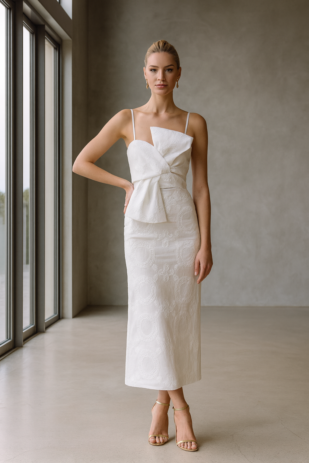 Maravilloso set top con lazada y falda en tejido de algodón bordado.