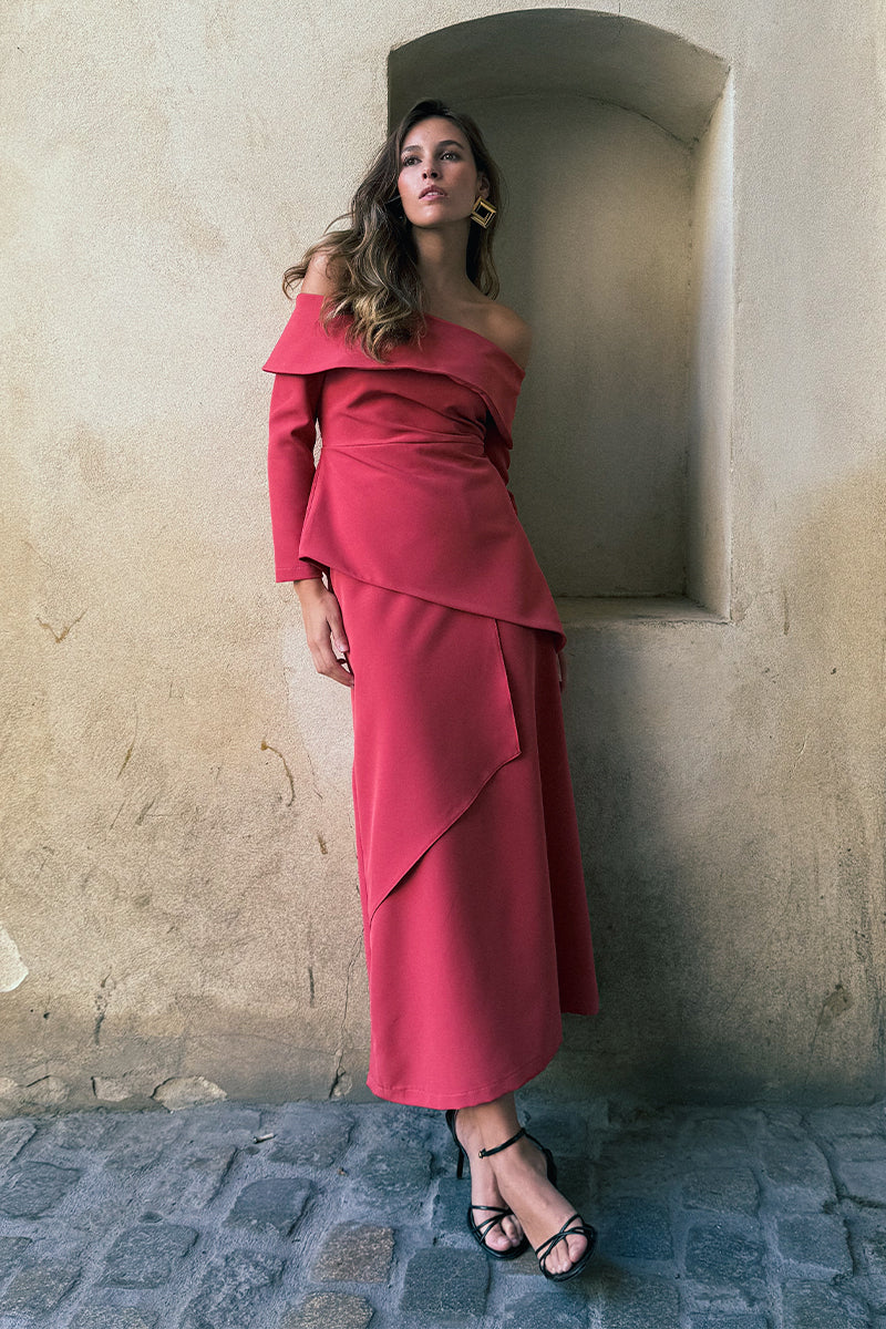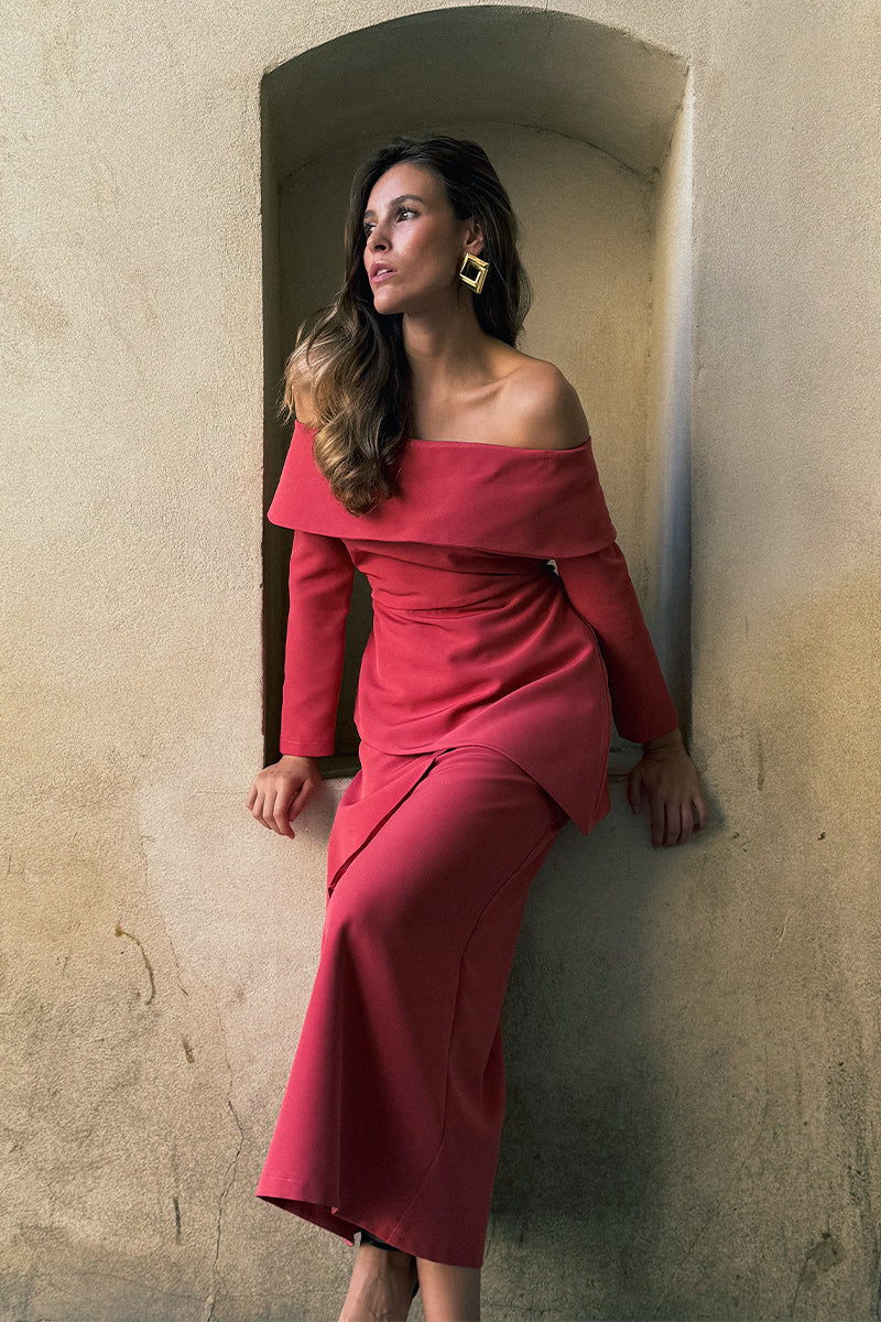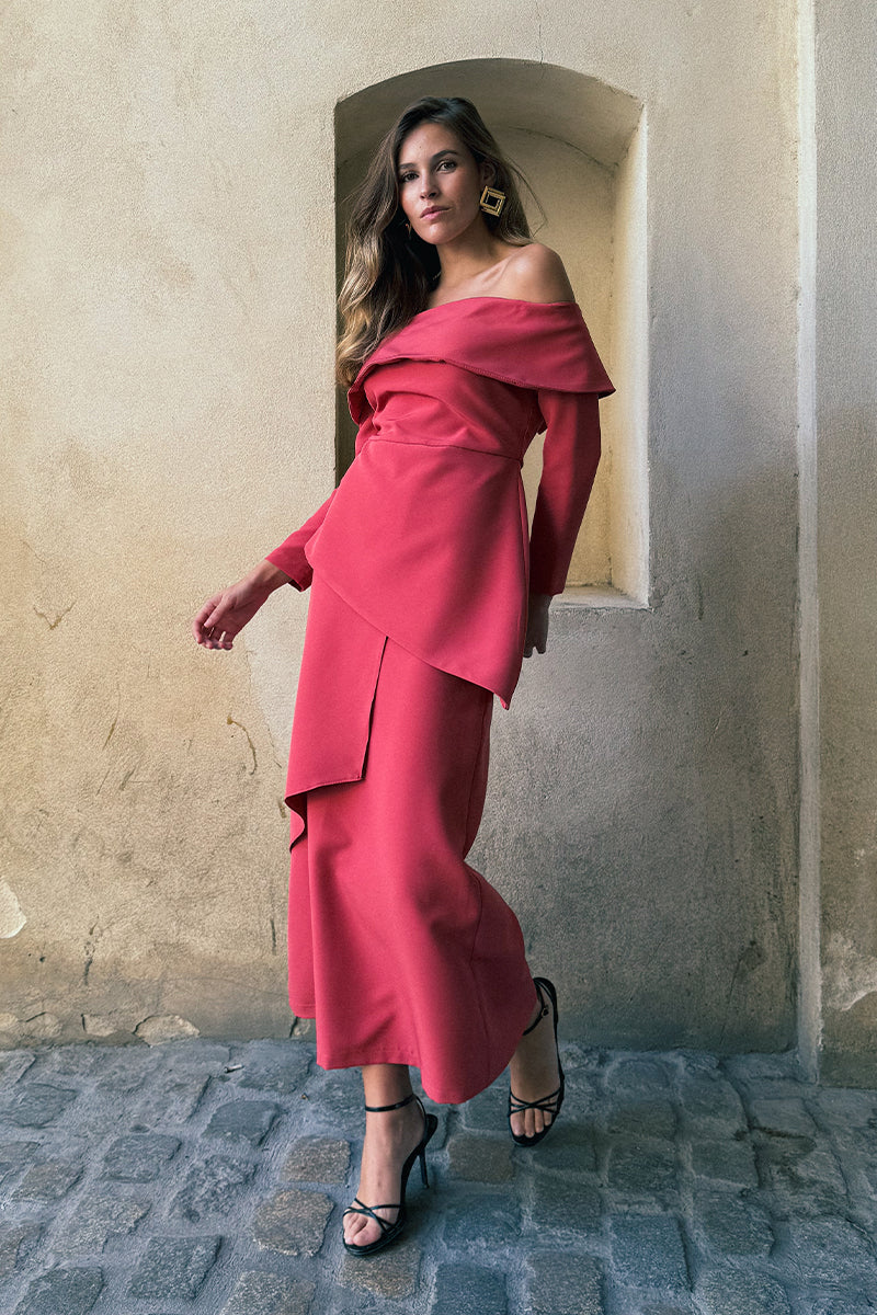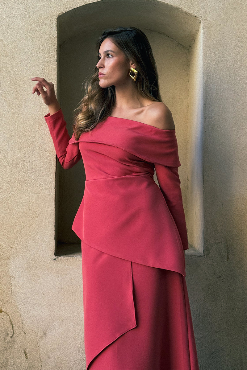 Conjunto de dos piezas top con escote barco y peplum y falda evasé con detalle al latera midi.