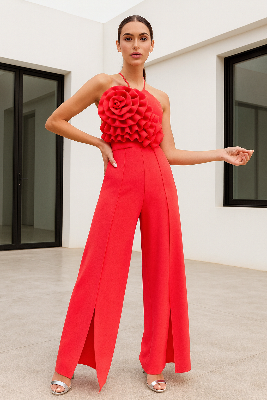 Fabuloso top cuello halter con flor. Pantalon con aberturas .