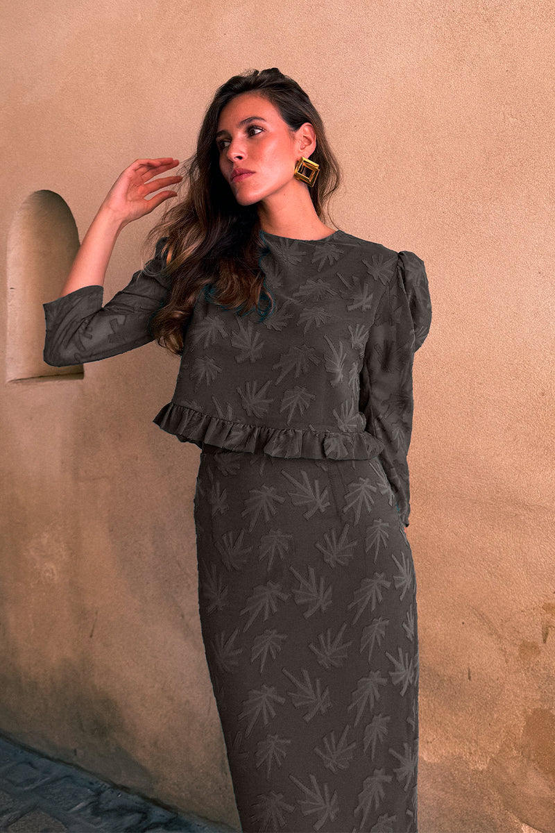 Conjunto compuesto por top con mangas tres cuartos abullonadas, minivolante en bajo y espalda abotonada, y falda de largo midi con abertura trasera.