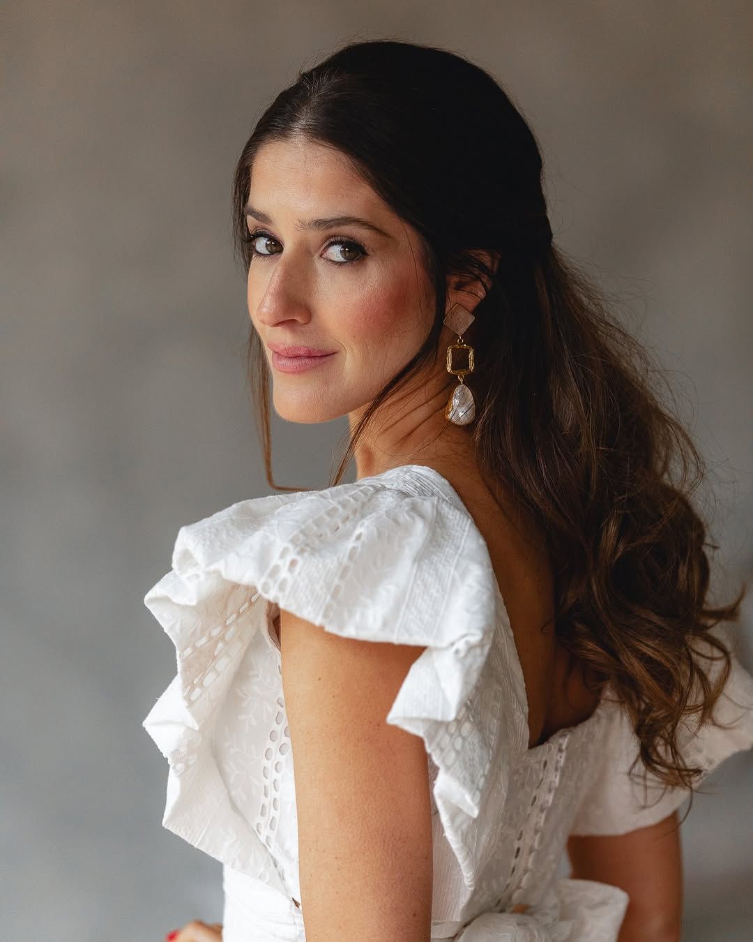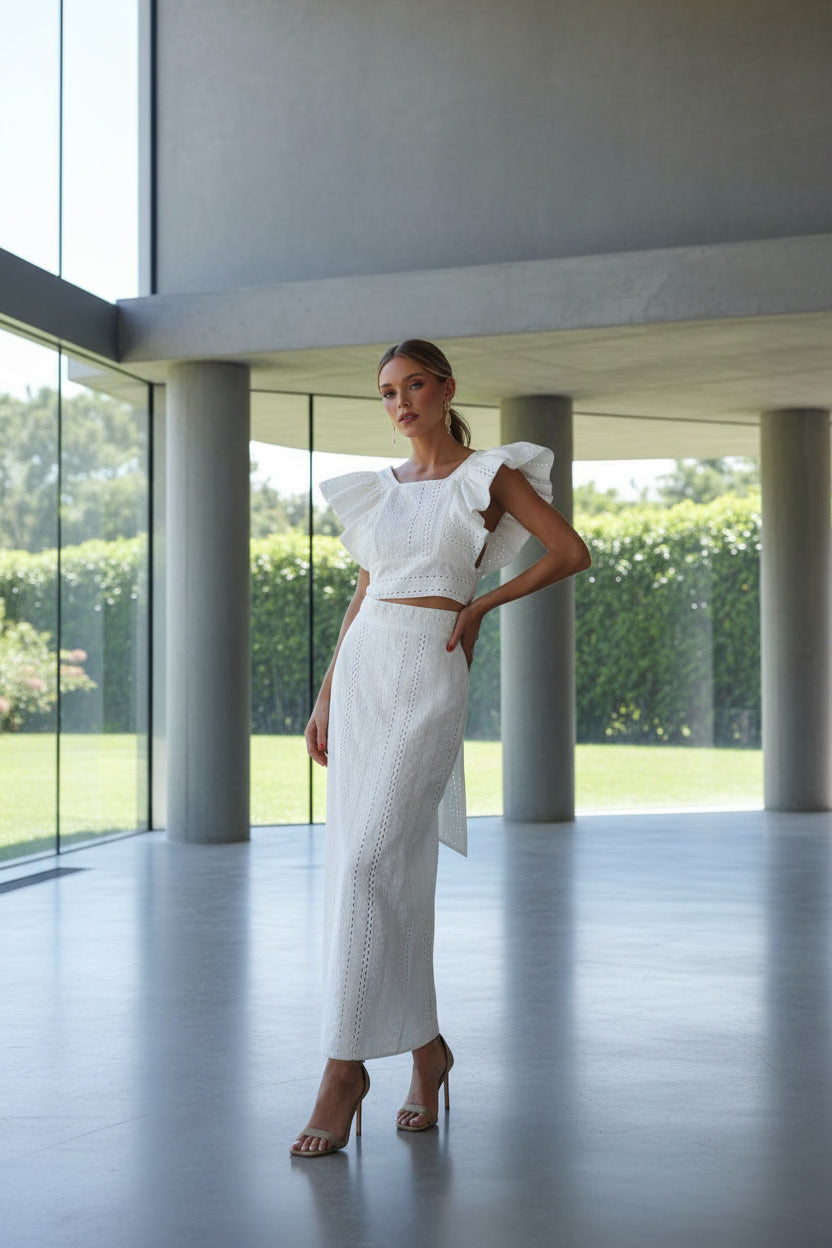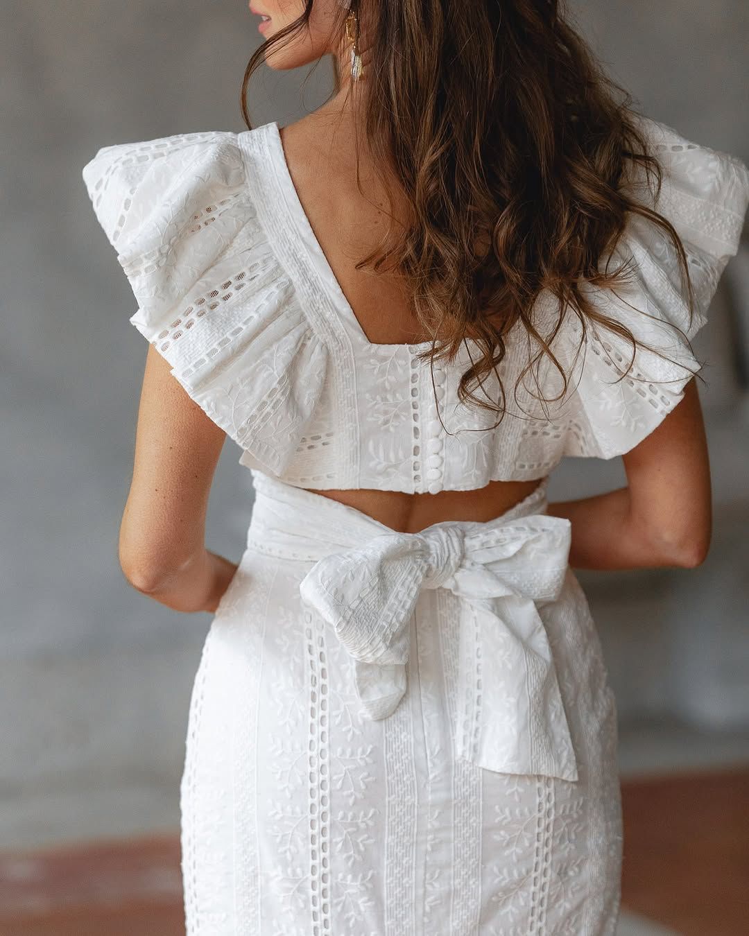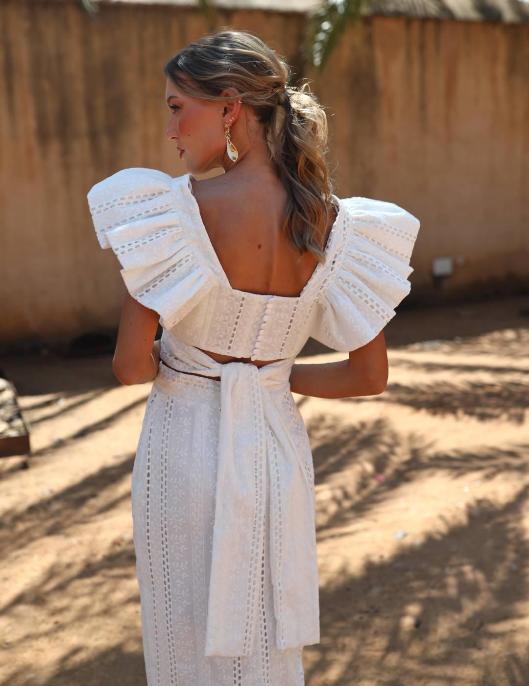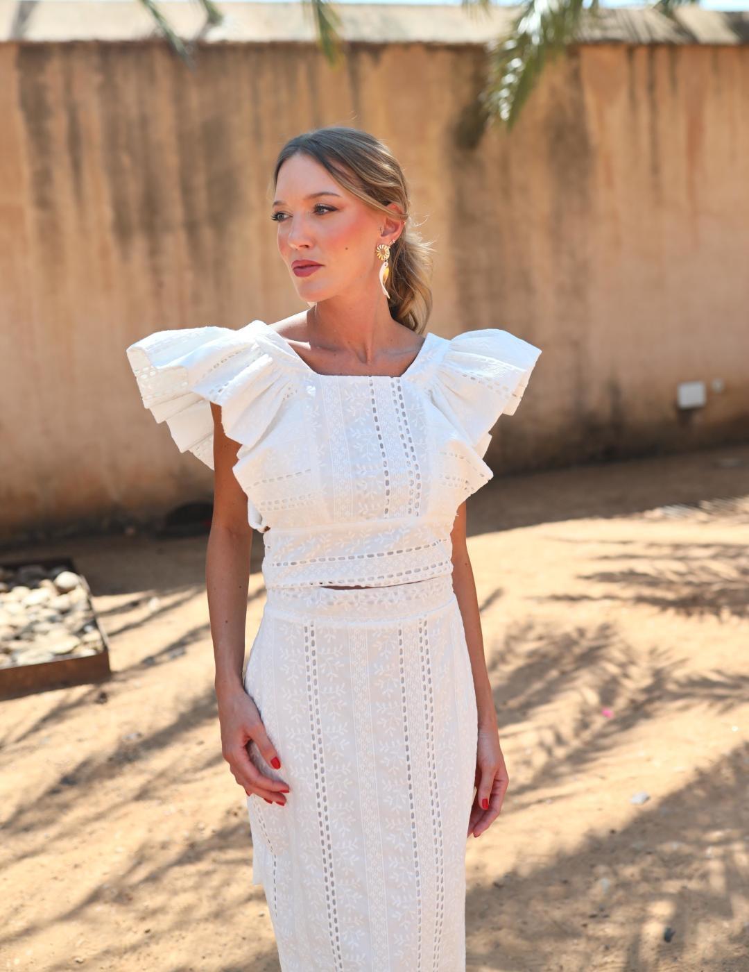 Top con volantes lazada trasera y falda recta con abertura trasera.