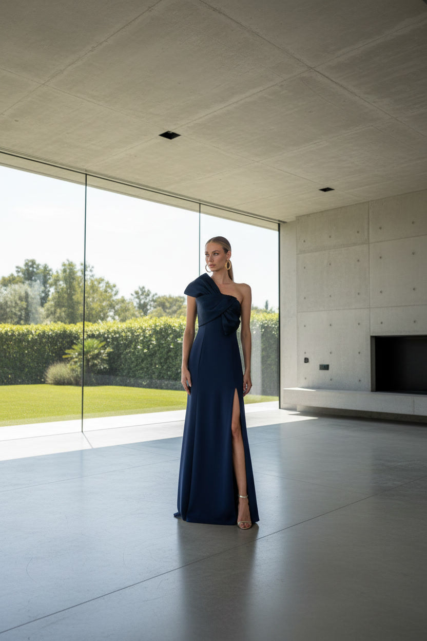 Este diseño destaca por un crepé texturado en escote, que aporta cuerpo y definición a la prenda sin perder elegancia. El tejido permite crear volúmenes arquitectónicos en el escote asimétrico, realzados mediante pliegues y formas envolventes que aportan carácter y sofisticación. Su acabado ligeramente granulado añade profundidad visual y un tacto refinado, mientras que la caída controlada del crepé equilibra perfectamente la firmeza del busto con la fluidez de la falda, logrando una silueta femenina, moderna y sumamente elegante.