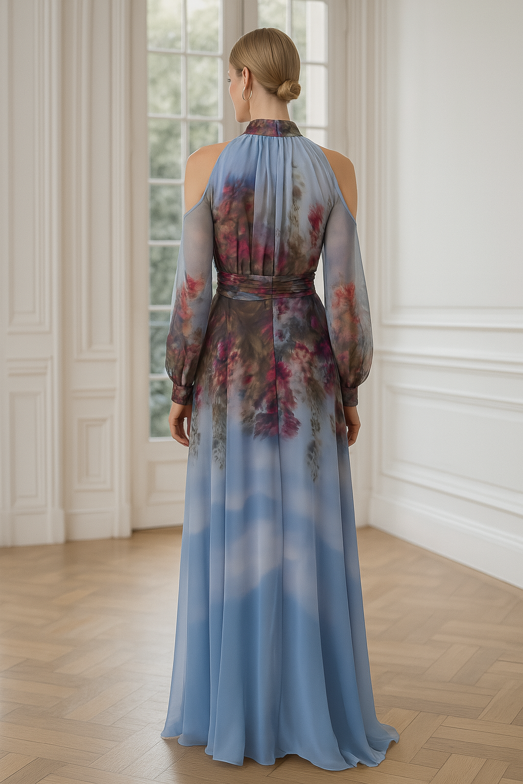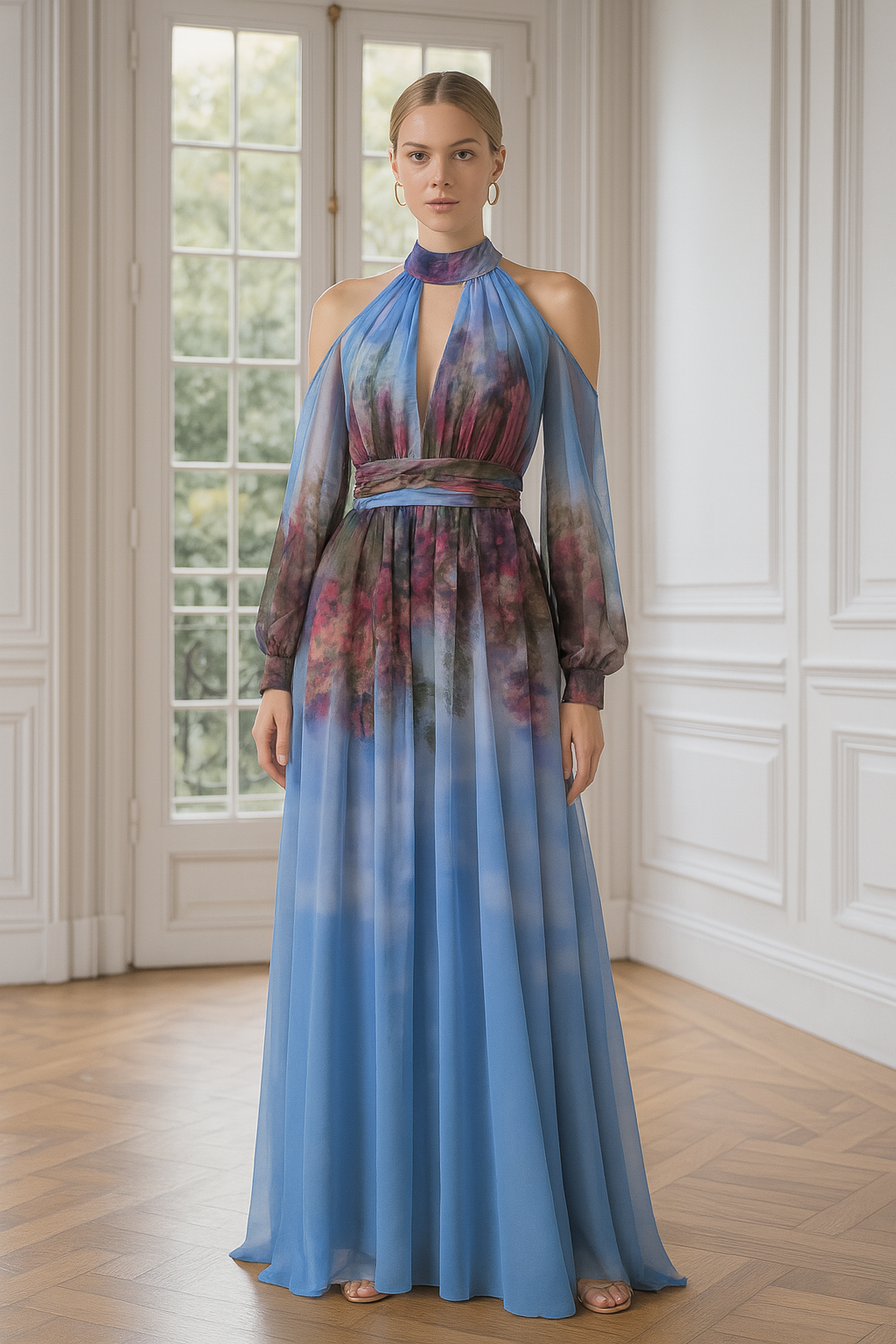 Vestido en tejido de gasa, con cuello halter con manga larga y cintura fruncida en un maravilloso azul con degradación floral.