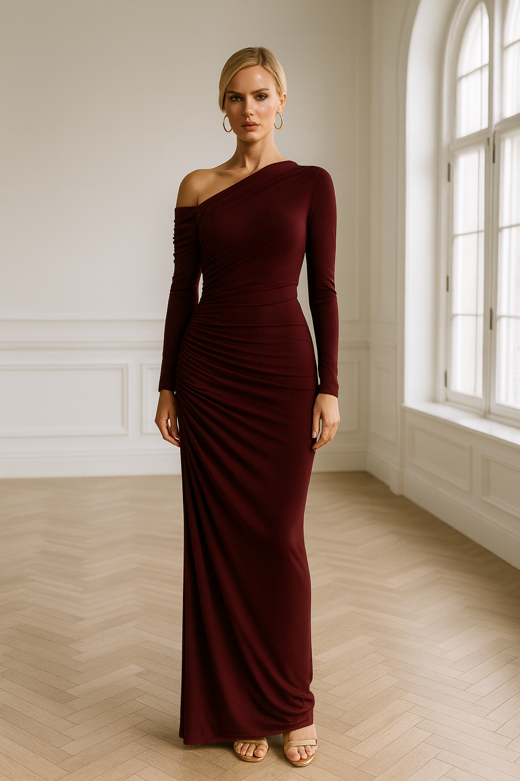 Fabuloso vestido midi en punto asimétrico con manga larga y drapeado lateral.