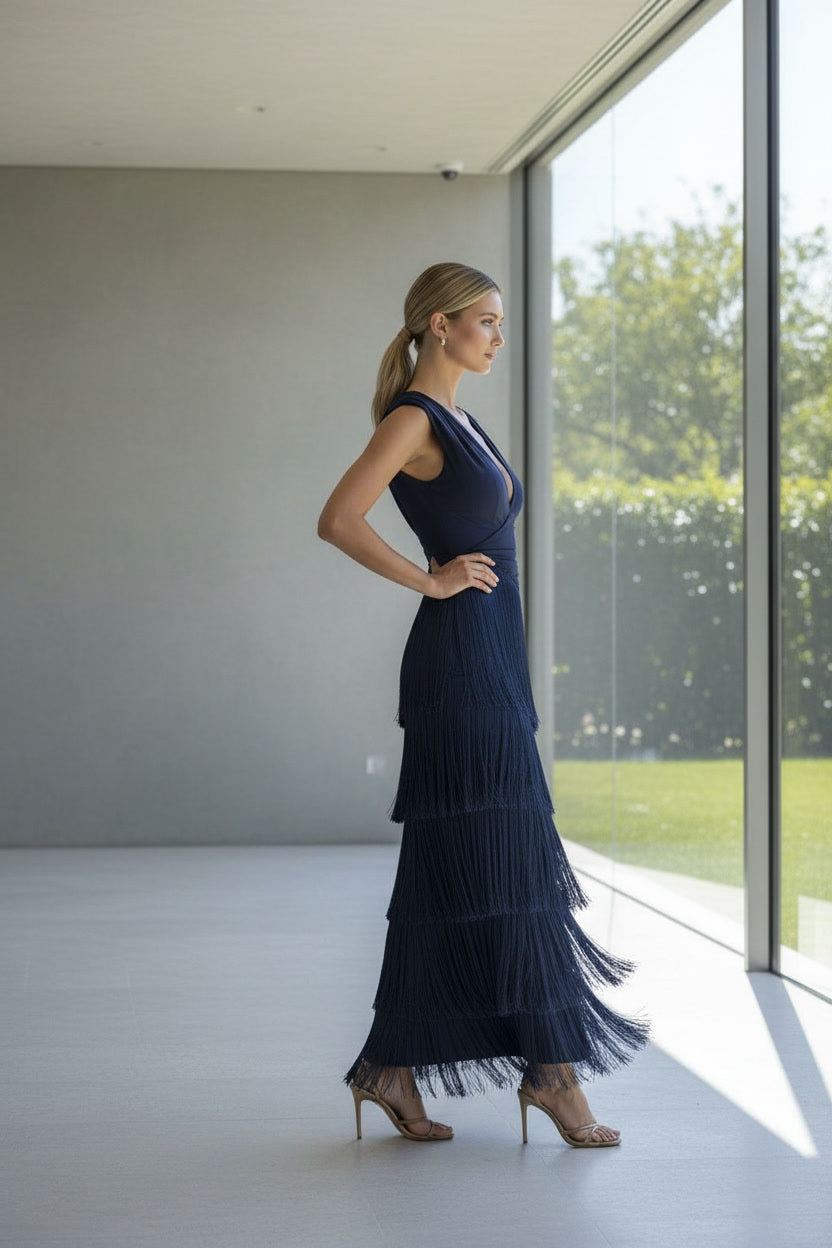 Fantástico vestido largo en tejido crepé punto, escote en V sin mangas, y con falda tubo completamente adornada en flecos