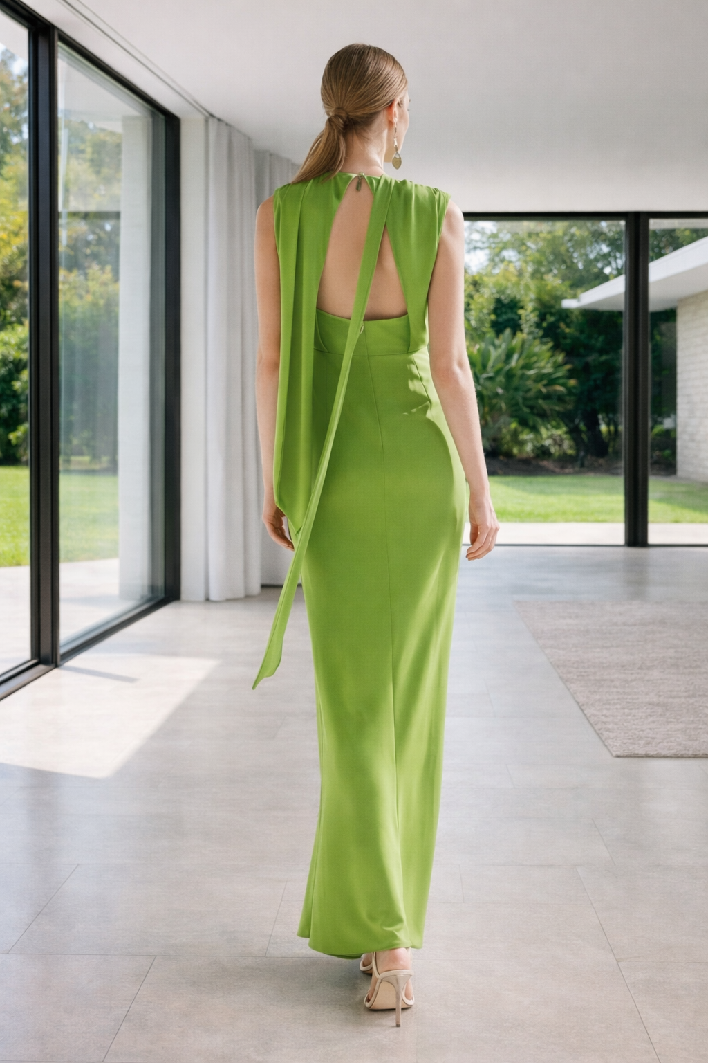 VESTIDO ESCOTE V, FRUNCIDOS CENTRALES CON ABERTURA CENTAL Y ESCOTE EN ESPALDA