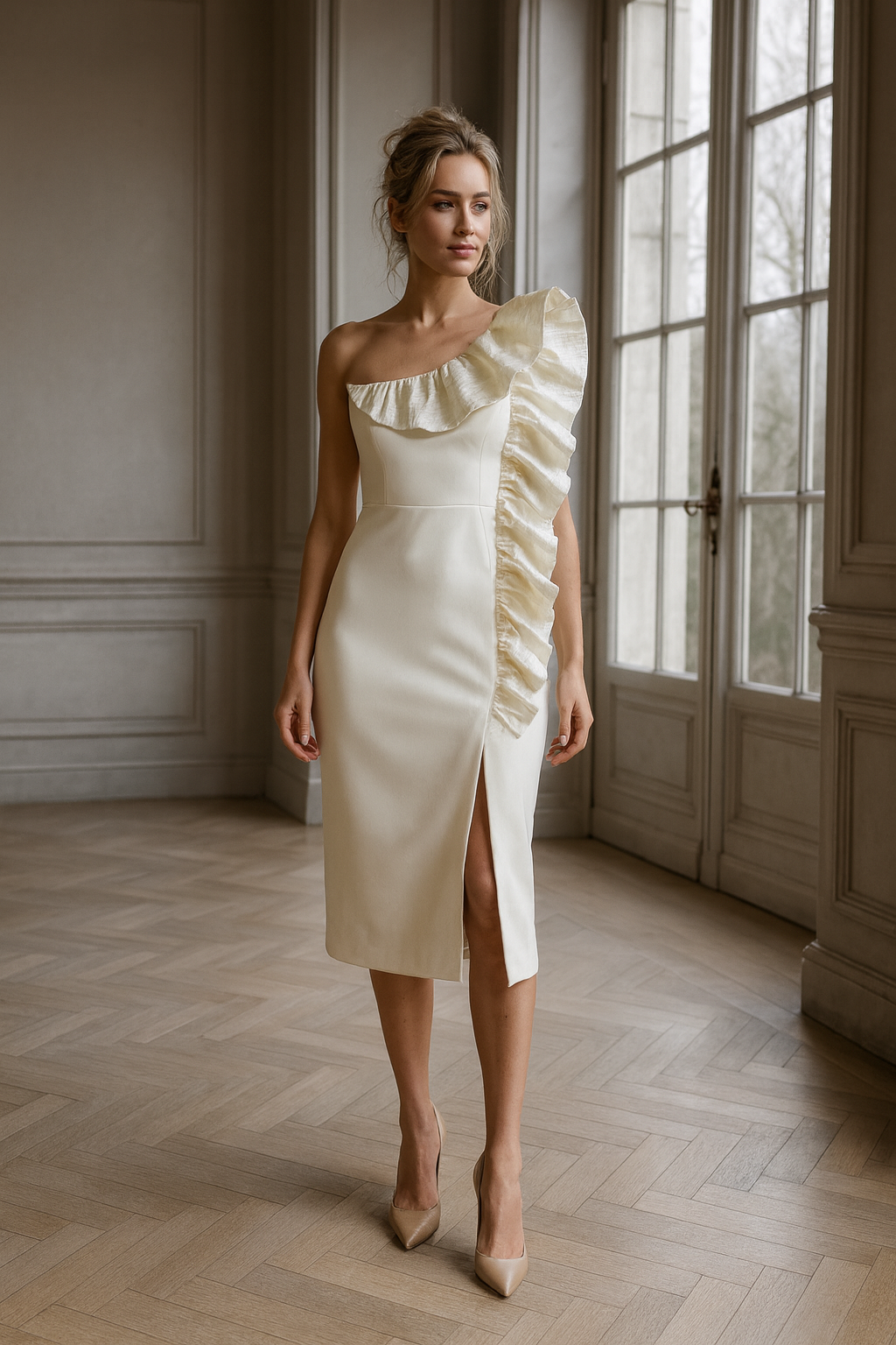 Vestido palabra de honor con volante lateral en tejido contrastado en beige y abertura lateral.