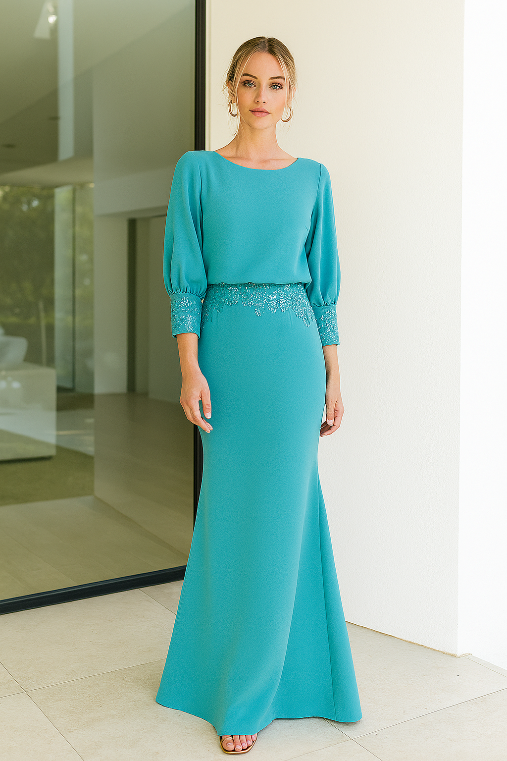 Fabuloso vestido largo en crepé de gasa con incrustaciones en guipur sobre cintura y mangas.